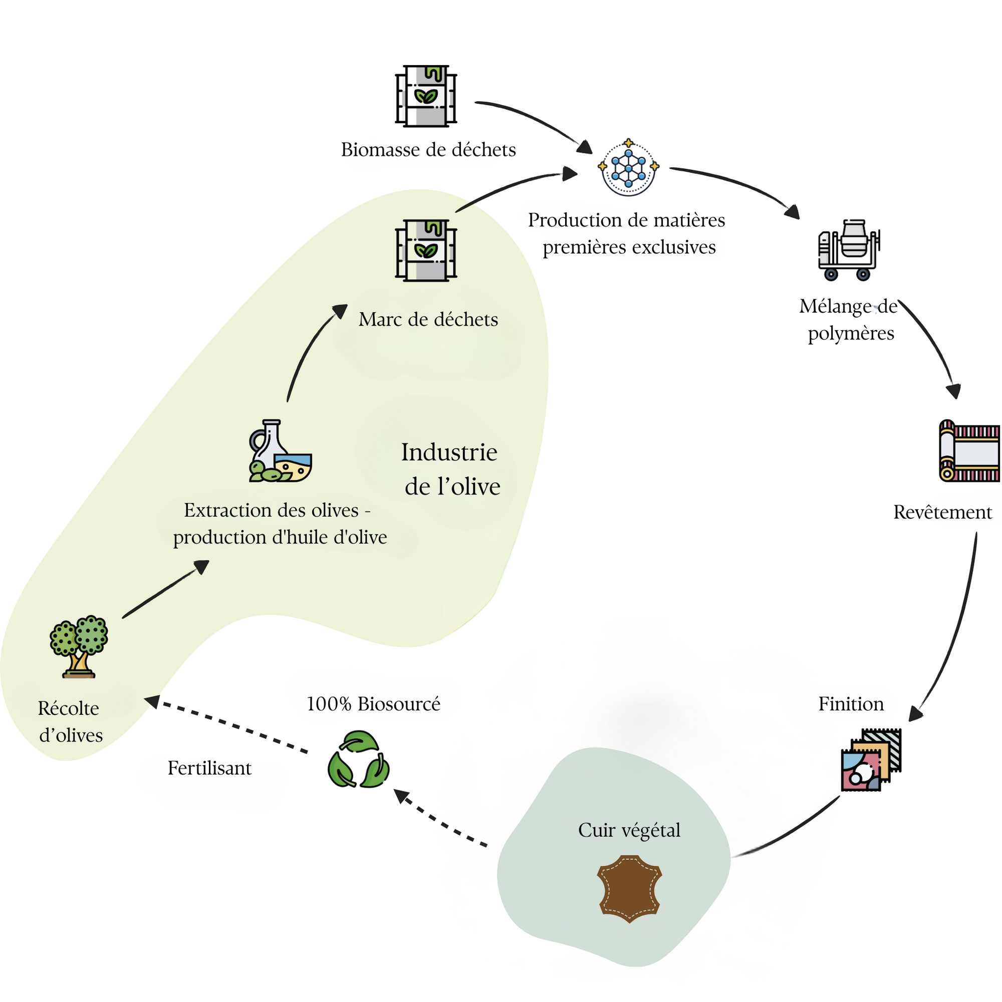 Cette matière est fabriquée en grande partie à base de marc d’olive, un co-produit issu de la fabrication de l’huile d’olive, revalorisé pour créer une alternative au cuir traditionnel.